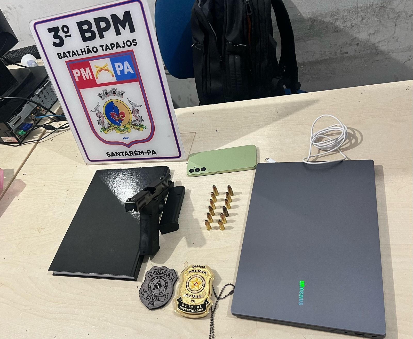 A partir das imagens, os agentes iniciaram diligências para localizar o autor. Durante as buscas, a polícia encontrou o notebook dentro da residência do suspeito, com a autorização dos familiares dele Após sua prisão, o homem assumiu que havia vendido a arma de fogo e o celular para terceiros.