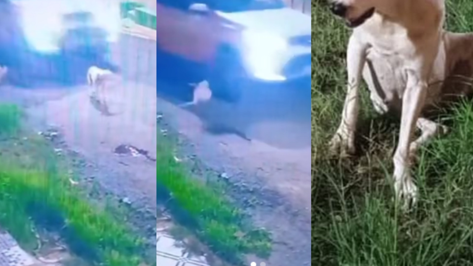 Câmera de monitoramento flagrou o momento em que o carro passou por cima do animal, que teve fraturas e foi resgatado. Cadela teve fratura, segundo ONG que resgatou para cuidados.