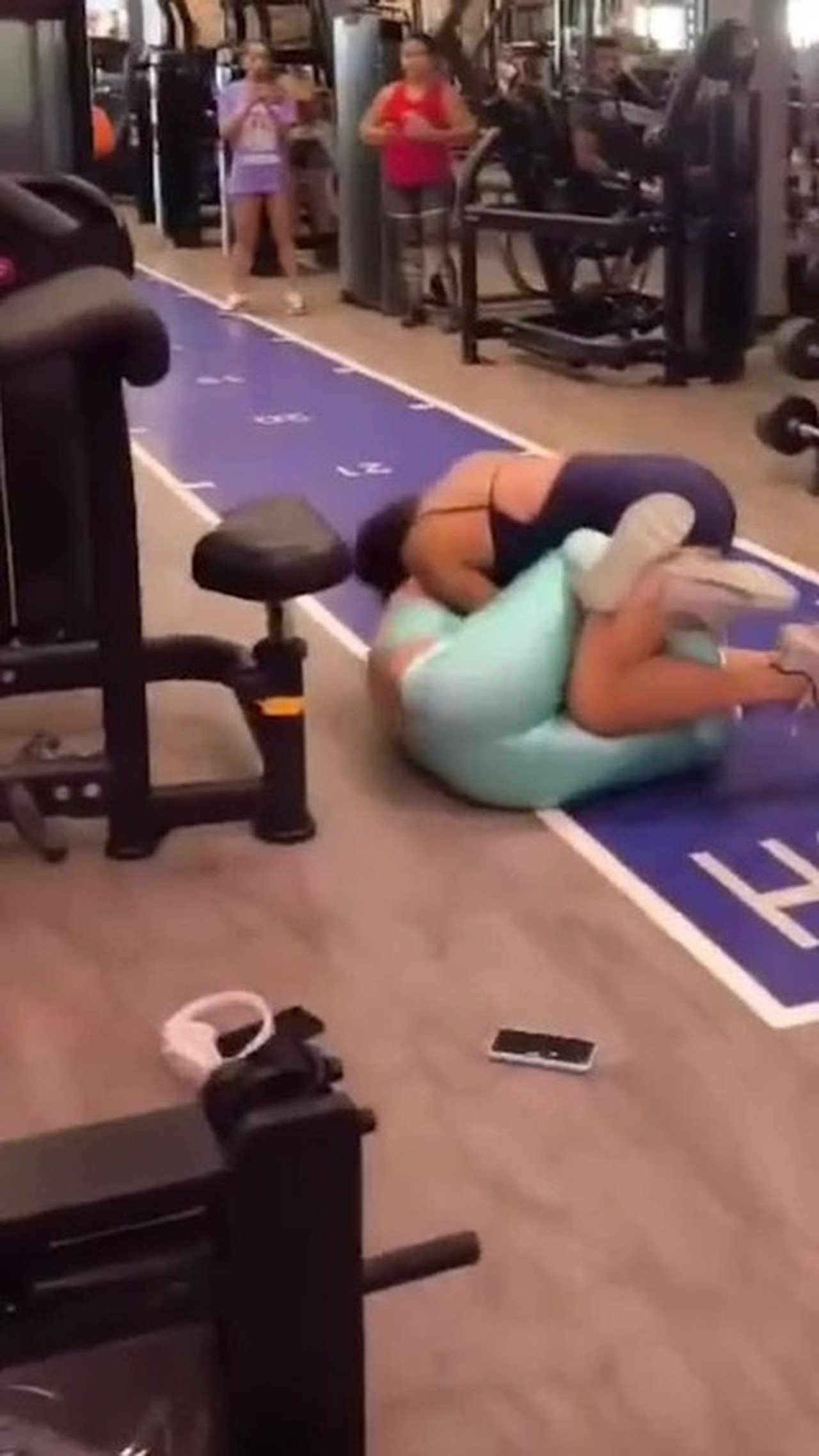 De um lado, estão duas mulheres jogadas no chão da academia, agarradas, uma puxando o cabelo da outra. Do outro, dois homens trocam socos e empurrões violentamente.