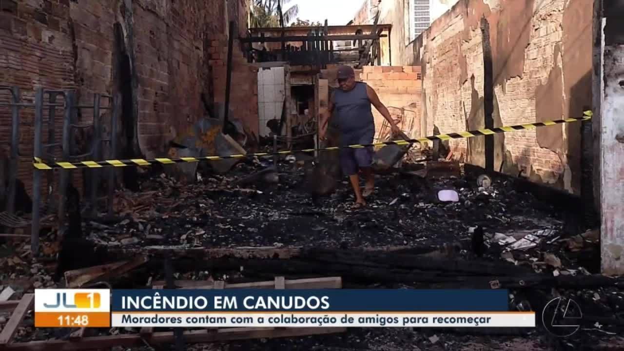 No incêndio, três casas foram destruídas e parte de um imóvel também foi afetado pelas chamas. Incêndio em Canudos: moradores contam com a colaboração de amigos para recomeçar