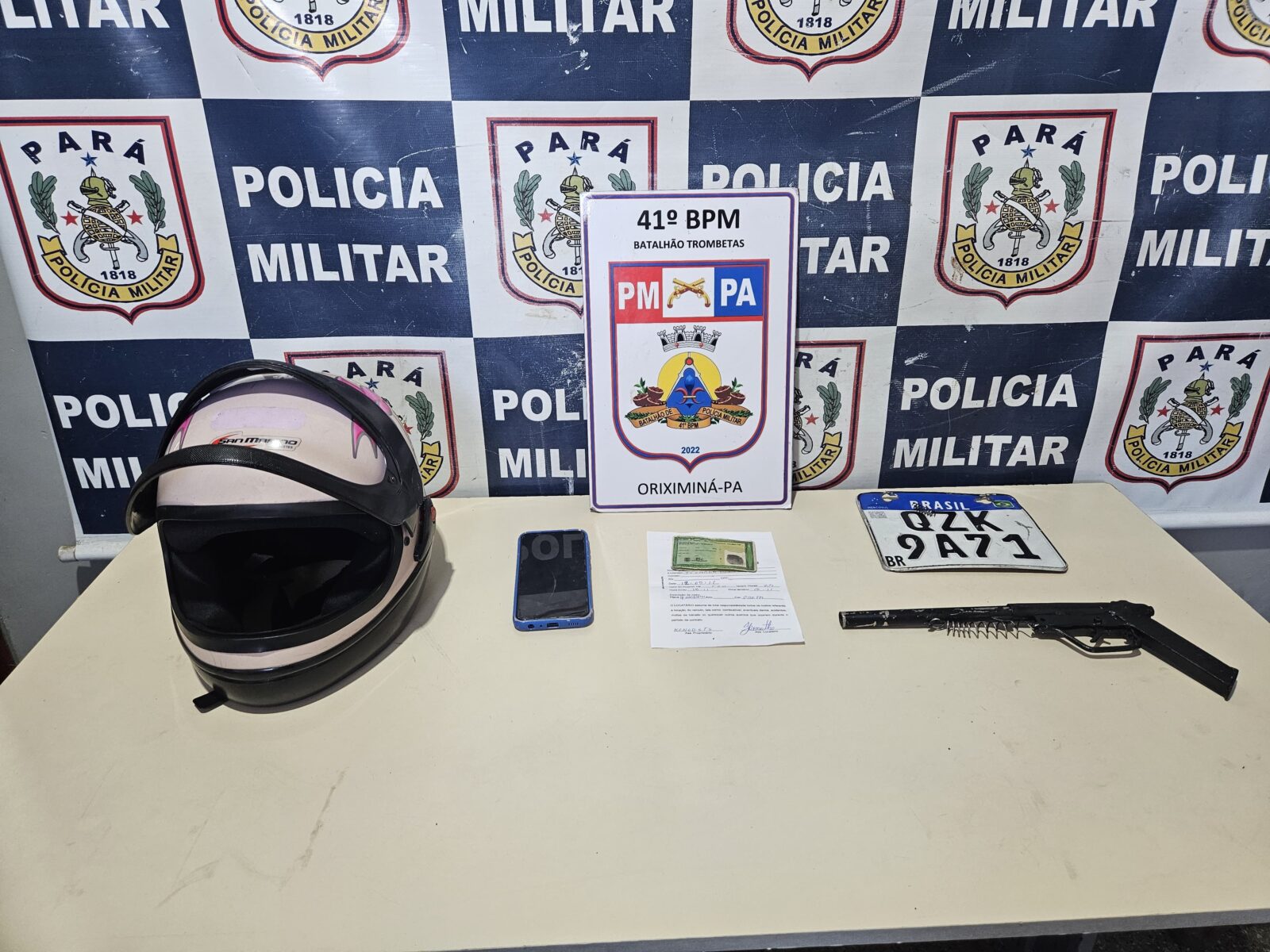 Arma de fogo de fabricação artesanal e documentos apreendidos pela Polícia Militar durante a prisão de dois suspeitos de assaltar um posto de combustível em Oriximiná. Motocicleta usada no crime ainda não foi localizada