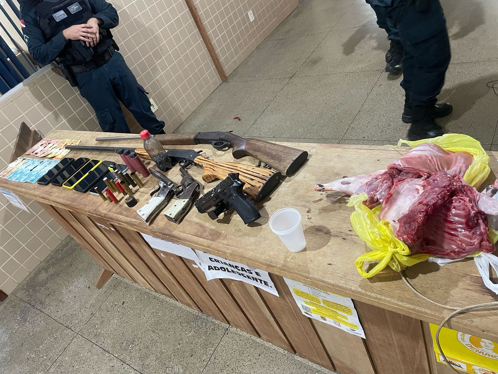 Durante o cumprimento do mandado foram localizadas e apreendidas duas espingardas, duas armas de fogo de fabricação caseira, uma pistola Airsoft, diversas munições intactas e outras deflagradas, pólvora e chumbinhos, um tambor de revólver 38, R$ 620 em espécie, quatro aparelhos de telefone celular e um animal de caça (cutia) abatido.