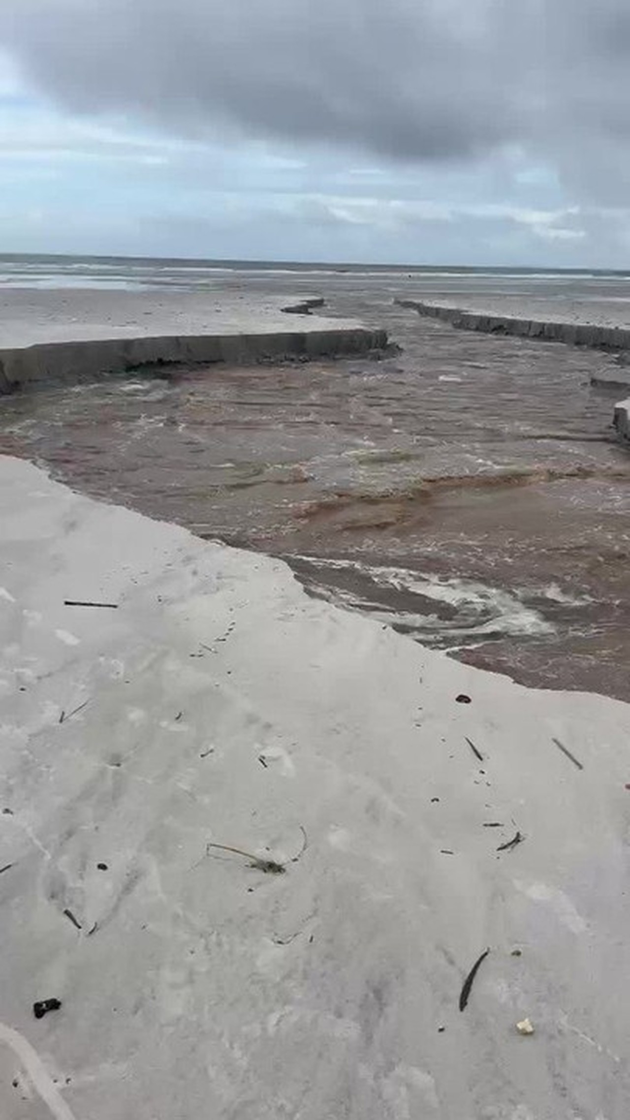 Enxurrada leva parte da faixa de areia e abre cratera na praia de Salinópolis, no Pará.