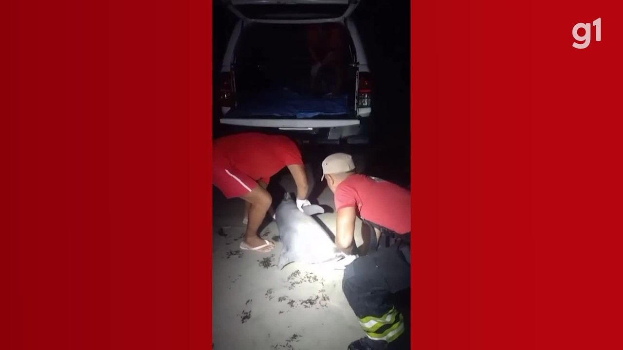 Debilitado, animal foi encontrado por banhistas e recebeu atendimento especializado antes de ser encaminhado para avaliação médica veterinária. Golfinho encalhado é resgatado na praia do Atalaia, em Salinas