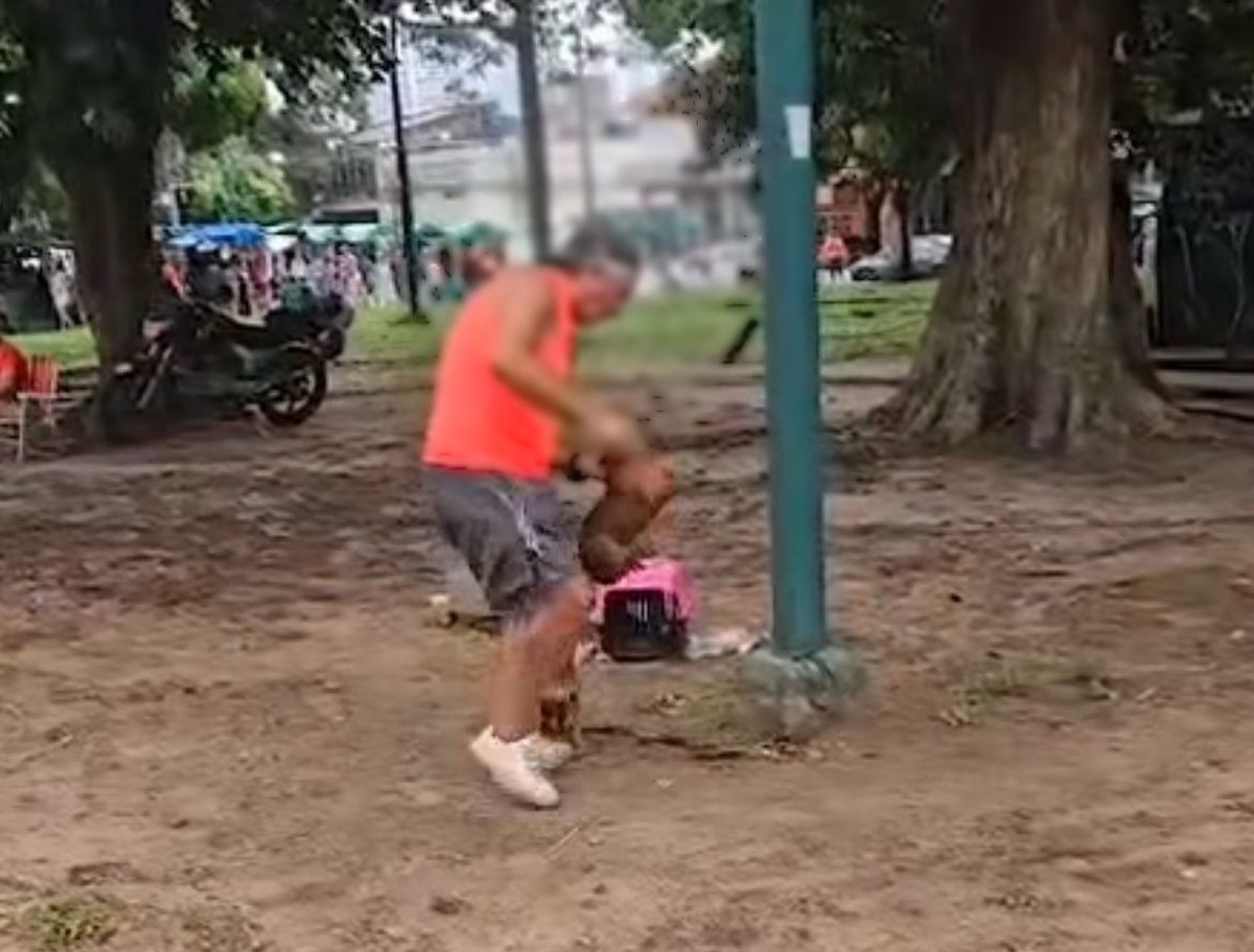 Um homem foi preso após ser filmado agredindo um filhote de cachorro neste domingo (29), na praça da República, em Belém.