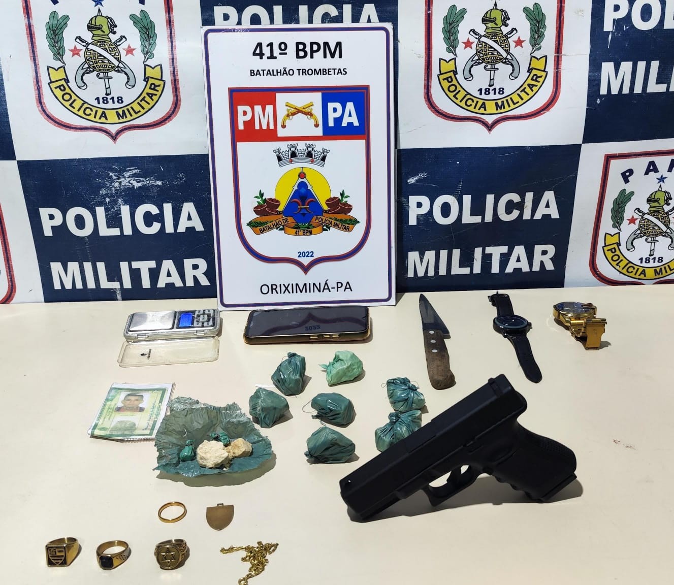 Na noite de quarta-feira (20), o motopatrulhamento do 41º Batalhão de Polícia Militar (BPM) realizava rondas no bairro São Lázaro, em Oriximiná, no oeste do Pará, quando identificou um homem em atitude suspeita. Ao perceber a presença da guarnição, o suspeito fugiu, mas foi jogando o material que estava com ele.