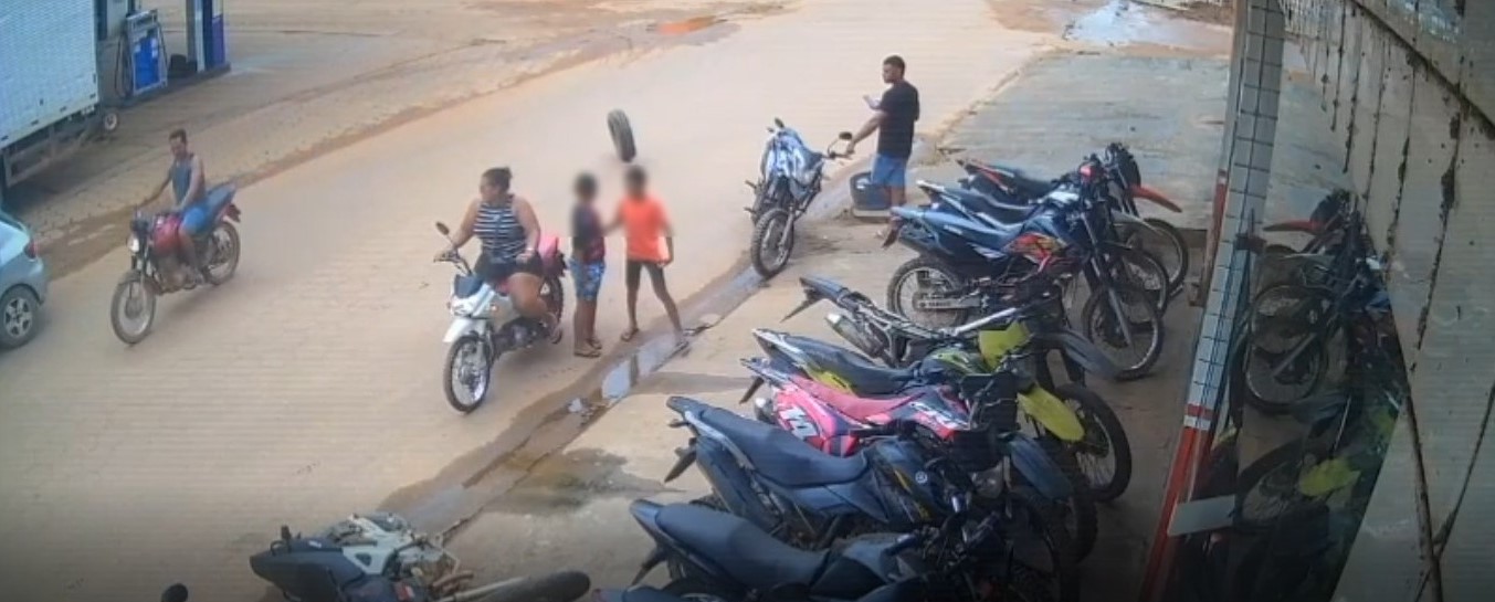 Nas imagens, é possível ver o momento em que a criança desce de uma motocicleta, acompanhada de outro menino e uma mulher. Segundos depois, um pneu se desprende de um veículo em movimento e segue desgovernado pela rua.