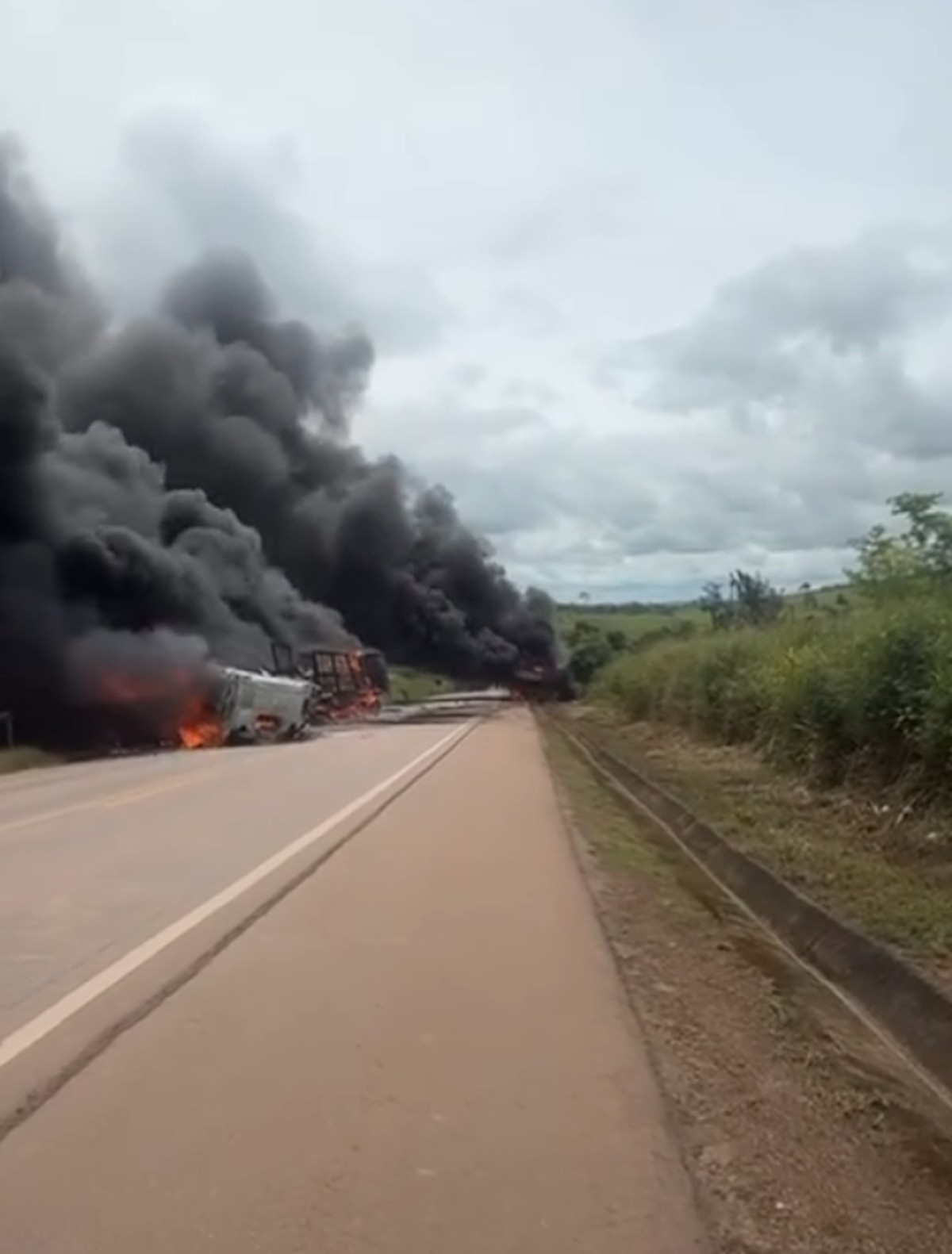 Três carretas pegaram fogo após se envolverem em um acidente na rodovia BR-163, nas proximidades da localidade Riozinho das Arraias, em Novo Progresso, no sudoeste do Pará. Duas pessoas morreram.