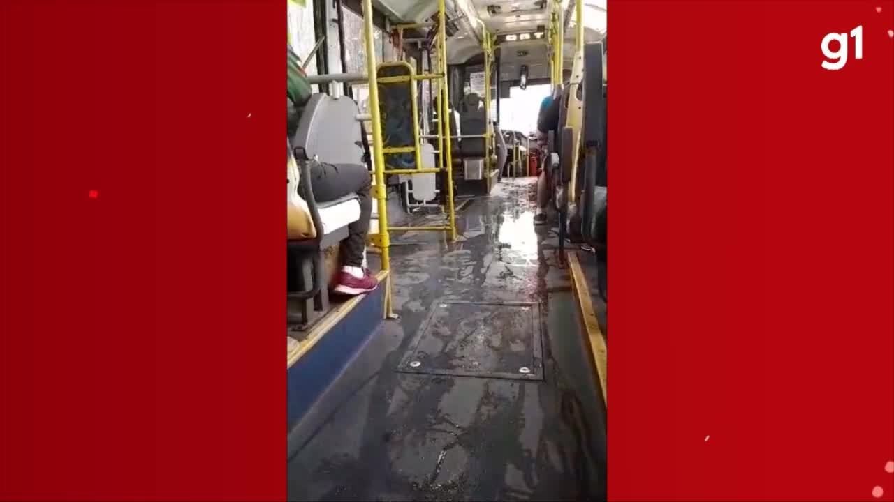 Um vídeo mostra a situação do BRT, que ficou com o chão todo molhado e com gotas de água caindo próximo aos passageiros.